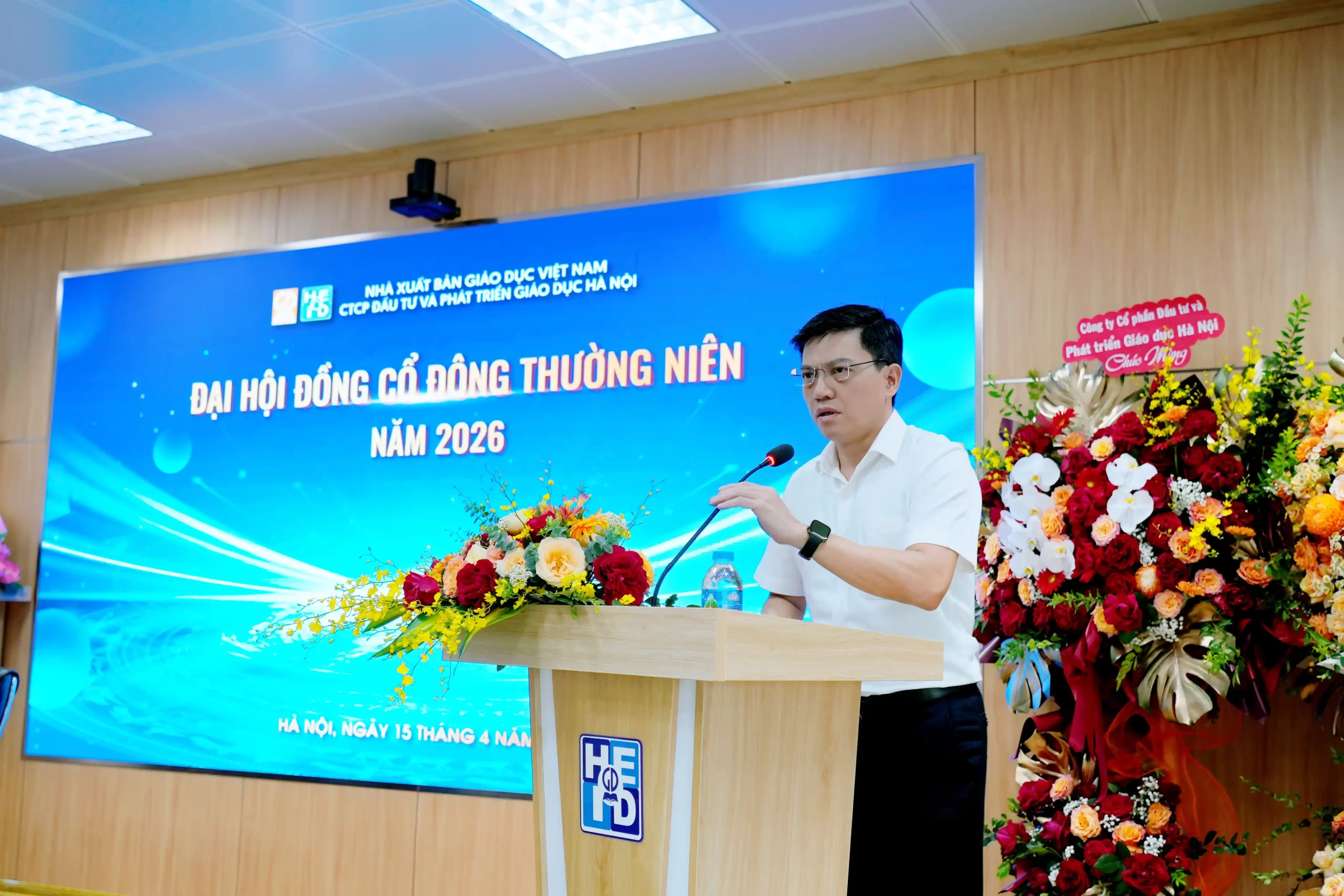 Phát biểu tại Đại hội, ông Lê Huy – Phó Tổng Giám đốc NXBGDVN – ghi nhận và đánh giá cao những kết quả nổi bật mà Công ty Cổ phần Đầu tư và Phát triển Giáo dục Hà Nội đạt được trong năm 2025, đặc biệt ở lĩnh vực sản xuất kinh doanh và triển khai các hoạt động hợp tác chiến lược.