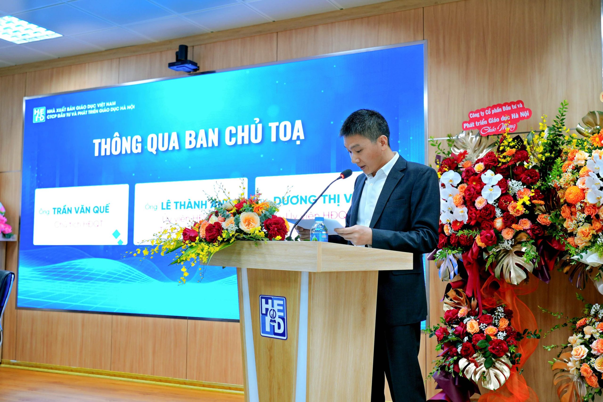Tham dự Đại hội, về phía Nhà xuất bản Giáo dục Việt Nam (NXBGDVN) có ông Phạm Vĩnh Thái – Thành viên Hội đồng thành viên (HĐTV) NXBGDVN; ông Phạm Văn Thắng – Thành viên HĐTV NXBGDVN; ông Lê Huy – Phó Tổng Giám đốc NXBGDVN; bà Lê Anh – Phó Trưởng ban Thư kí biên tập NXBGDVN; về phía NXBGD tại Hà Nội có sự tham gia của ông Nguyễn Quốc Hồng – Giám đốc NXBGD tại Hà Nội; về phía Công ty TNHH Hãng Kiểm toán AASC có ông Nguyễn Trường Minh – Chủ nhiệm kế toán; về phía Công ty Cổ phần Đầu tư và Phát triển Giáo dục Hà Nội có ông Trần Văn Quế – Chủ tịch Hội đồng quản trị Công ty, ông Lê Thành Anh – Uỷ viên Hội đồng quản trị kiêm Tổng Giám đốc Công ty, bà Nguyễn Thị Thu Hồng – Phó Trưởng Ban Tài chính – Kế toán NXBGDVN kiêm Trưởng ban Kiểm soát Công ty; cùng các thành viên Hội đồng quản trị, Ban Kiểm soát, Ban điều hành Công ty và toàn thể quý cổ đông của Công ty Cổ phần Đầu tư và Phát triển Giáo dục Hà Nội.