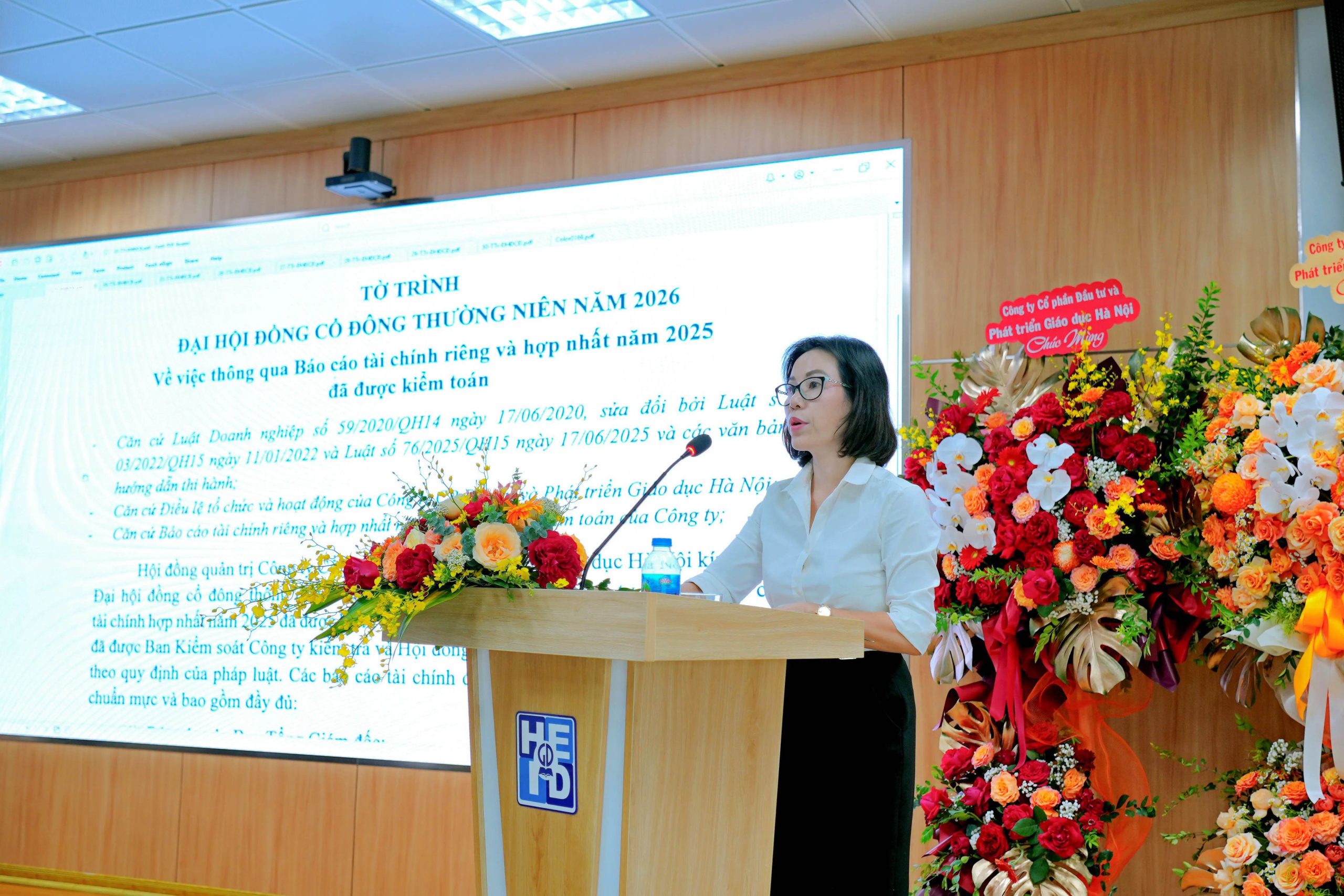 Tiếp nối chương trình, bà Dương Thị Việt Hà – Ủy viên Hội đồng quản trị kiêm Phó Tổng Giám đốc Công ty – đã trình bày các báo cáo và tờ trình quan trọng trước Đại hội. Nội dung trình bày tập trung vào Báo cáo tài chính năm 2025 đã được kiểm toán, phản ánh trung thực, đầy đủ tình hình tài chính và kết quả hoạt động sản xuất kinh doanh của Công ty.